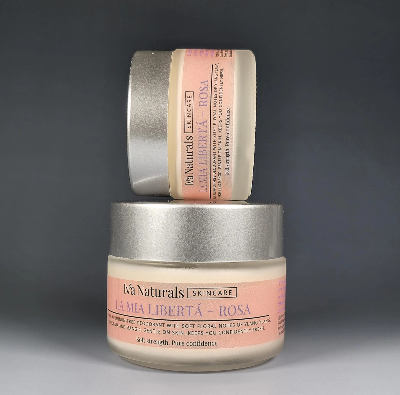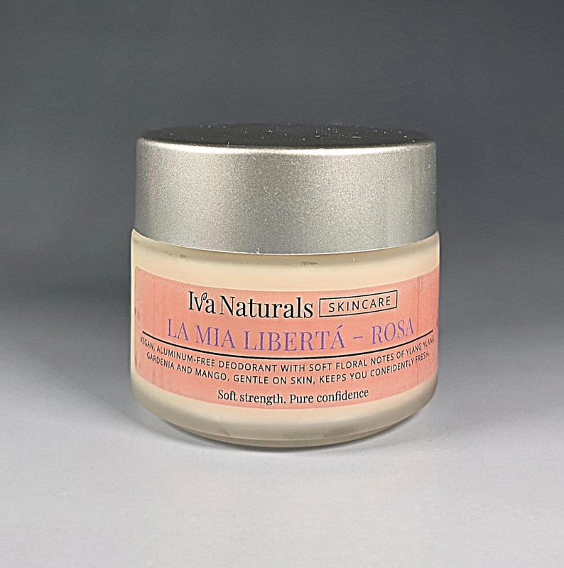 Naturlig deodorant som vårdar och skyddar hela dagen. La Mia Libertá – Rosa kombinerar ekologiskt sheasmör och mandelolja med bikarbonat och magnesiumhydroxid för effektivt lukt¬skydd. Doften är en varm och blommig mix av ylang ylang, vanilj, tiaré och mango. Finns i förpackningar om 50 ml och 100 ml. Fri från aluminium, alkohol och syntetiska dofter.